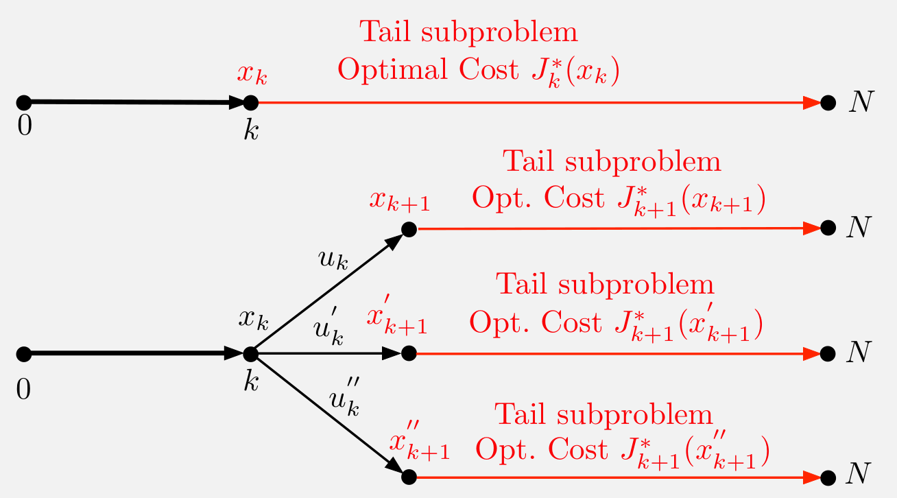\[ V(\mathbf{x}_k) = \displaystyle \min_{u \in \mathbf{U}} \left[ c(\mathbf{x}_k, \mathbf{u}_k) + V(f(\mathbf{x}_k, \mathbf{u}_k)) \right] \]\[ V(\mathbf{x}_k) = \displaystyle \min_{u \in \mathbf{U}} \left[ c(\mathbf{x}_k, \mathbf{u}_k) + V(\mathbf{x}_{k+1}) \right] \]