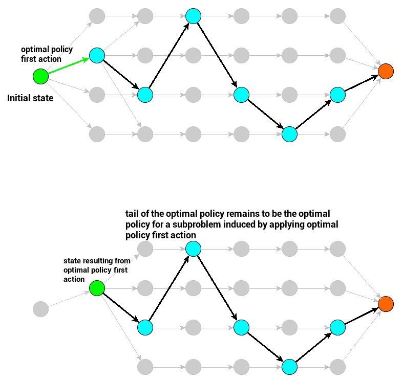 Green arrow is optimal policy first action (decision) – when applied it yields a subproblem with new initial state. Principle of optimality is related to this subproblem optimal policy.