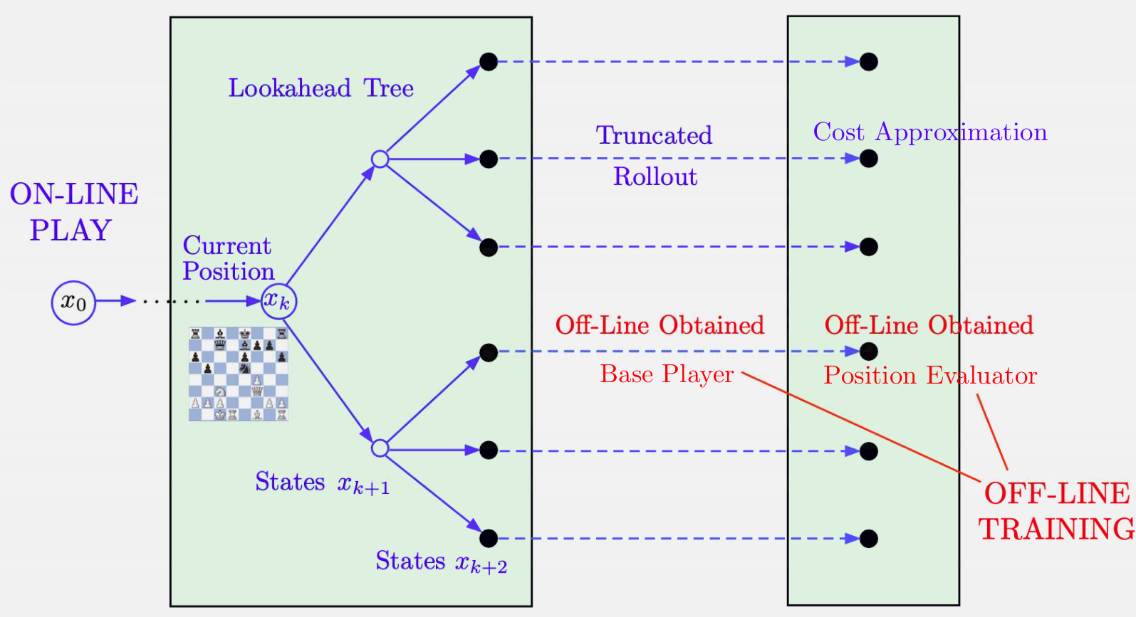 In AlphaZero, the policy and value networks are trained off-line and an approximate version of the fundamental DP algorithm of policy iteration. A separate on-line player is used to select moves, based on multistep lookahead minimization and a terminal position evaluator that was trained using experience with the off-line player.