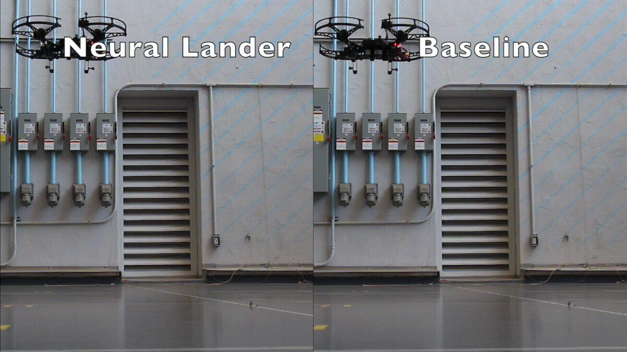 Fig. 18 Comparison of drone landing with and without neural network modelling of residual ground effect. Taken from Neural Control blog post.#